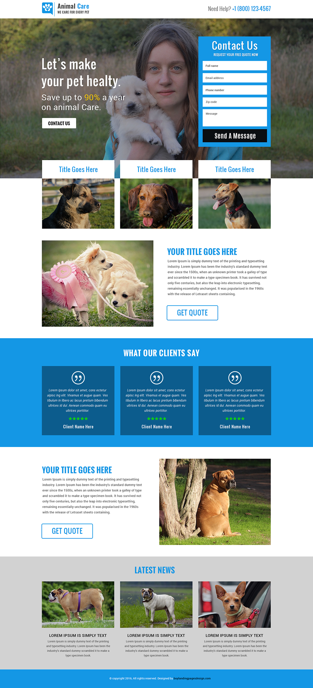 Best responsive pet care and animal landing page design clean template for your business or service related to pet and animal by buy landing pages design.